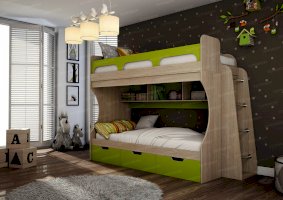 Атмосферу счастья и беззаботности приносит в дом детская «Киви». Сочетание оттенков лайм и дуб молочный выглядит очень жизнерадостно. Малышам нравится отдыхать и играть в такой комнате. Они с удовольствием спят на двух- или одноярусной кровати, хранят вещи в шкафу и на стеллажах, убирают игрушки в специальную тумбу и учат уроки за удобным письменным столом.