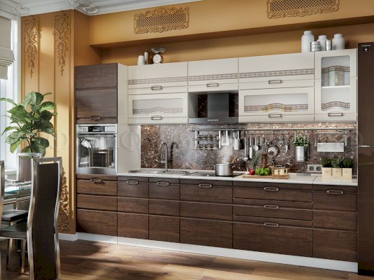 Элегантная кухня «Техно 4» — настоящее украшение для любой квартиры. Такая кухня наполнена теплом, уютом и отличается своими эстетическими достоинствами. Красивый орнамент гармонично сочетается с цветом фасадов, такая кухня выглядит благородно и универсальна по своему дизайну.