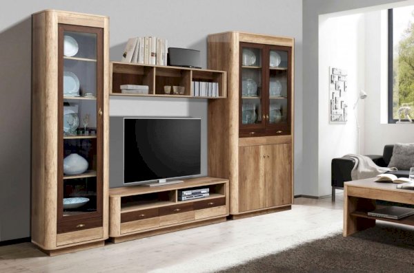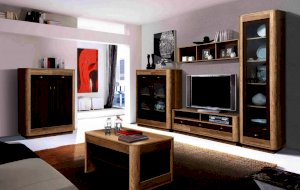 Тумба предназначена под ТВ либо любую другую технику. На верхней панели можно расположить очень многое: телевизор, стереосистему, проигрыватель. Под столешницей находятся два открытых отсека, а под ними – три закрытых выдвижных ящика. Внешне применен принцип асимметрии: три ящика под двумя полками. Такой прием делает дизайн более интересным и нестереотипным.