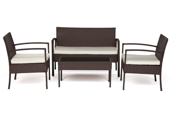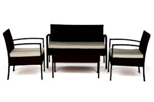 Материал: каркас - металл, спинка и сиденье - полиротанг, столешница - стекло, мягкие элементы - ткань полиэстер с пропиткой от дождя