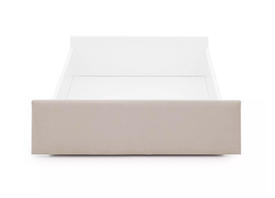 Ящик не является частью кровати, а представляет собой отдельную конструкцию. Выдвигается наш ящик не на направляющих, как встроенные, а на собственных прорезиненных колесиках. Это позволяет выдвигать его на свободное расстояние от кровати, а также выдерживать больший вес наполнения. Ящик удобно устанавливается в кровать, за счет приподнятой задней стенки ящик упирается в спинку кровати и не проваливается вглубь. Под кровать умещается 2 ящика.