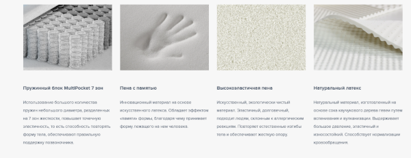 Наполнение из натурального латекса и материала с эффектом памяти и современного гипоаллергенного материала Foam в комбинации с блоком независимых пружин MultiPocket, имеющий 7 зон различной степени упругости, плотностью 1 000 пружин на спальное место, передают невероятное ощущение комфорта и обеспечивают качественный отдых вне зависимости от индивидуальных особенностей.