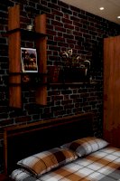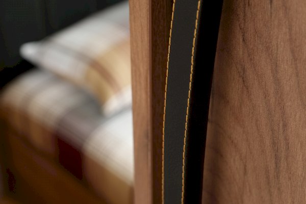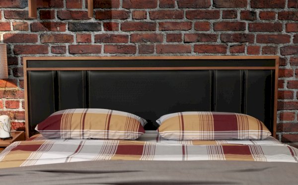 Изголовье кровати обтянуто экокожей черного цвета.