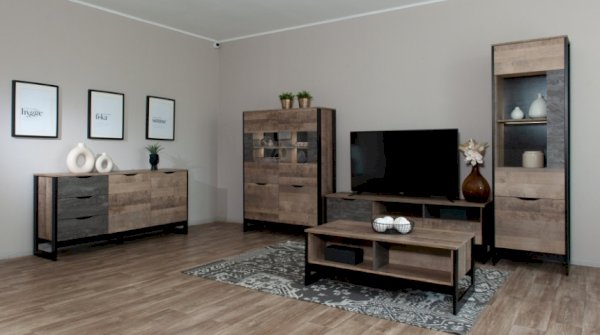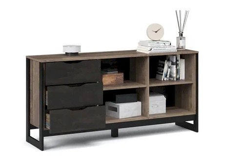 Функциональный вместительный комод в стиле лофт, оснащен тремя ящиками на телескопических направляющих и закрытыми полками для хранения вещей и аксессуаров. Отсутствие лицевой фурнитуры подчеркивает минимализм и геометрию модуля. Особенность дизайна – это сочетание реалистичных по цвету и тактильности трендовых декоров, которые соответствуют последним городским тенденциям. «Дуб Гранж» привлекает имитацией вручную обработанного дерева и выразительной зернистой текстурой, характерной формой досок. Стильный серый цвет «Железного камня» с металлическими разводами и новая текстура состаренной штукатурки в сочетании с гладкостью металла вносят индустриальный колорит. Оригинальные ножки-опоры из МДФ контрастного цвета придают изюминку интерьеру.