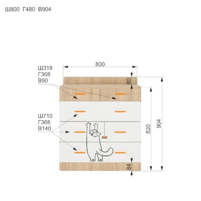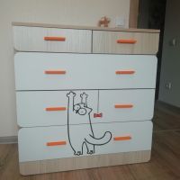 Привозят в разобранном виде - упаковано на отлично. При распаковке минимум запаха и стружки древесной. Сборка своими силами без проблем - все отверстия на месте, крепежа с запасом. Направляющие без доводчиков, хлипенькие (соответствуют цене комода). Но свою работу пока выполняют и нареканий к ним нет. В комплекте ручки 2х цветов (оранжевые и мятные). Ящики внутри 37х71х16 см. Белая плёнка, покрывающая фасады, тонкая и фактурная (шершавая) - напоминает бумагу. Следы грязных пальцев после установки вытерли влажной тряпкой. Но насколько её хватит в процессе эксплуатации и как будет мыться не понятно, влагостойкой не выглядит. Резюмируя - и родители и ребёнок довольны.